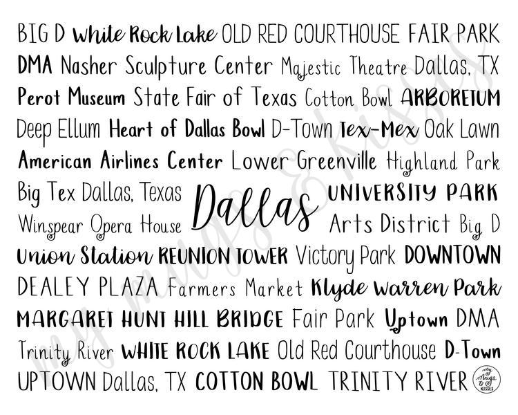 Each Dallas Digital Download is customizable so make sure to take advantage of our personalization software and add your favorite street, restaurant, business, school and other memories! There is no added cost for personalizing your digital download. You can easily type in all your own words, choose colors, pick from several different font options and even see your design update in real time when you make changes!