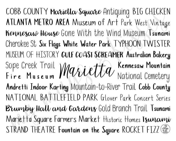 Each Marietta Digital Download is customizable so make sure to take advantage of our personalization software and add your favorite street, restaurant, business, school and other memories! There is no added cost for personalizing your digital download. You can easily type in all your own words, choose colors, pick from several different font options and even see your design update in real time when you make changes!