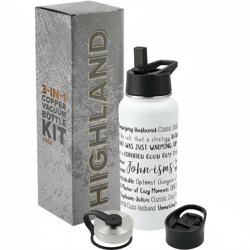 The Highland 3-in-1 Copper Vacuum Insulated Bottle Kit 32oz is the perfect item for an active lifestyle. Kit includes three types of lids, a screw on straw lid, a screw on chug lid and a screw on flip closure lid. Durable, double-wall stainless steel vacuum construction with copper insulation, allows your beverage to stay cold for up to 48 hours and hot for at least 12 hours. The construction also prevents condensation on the outside of the bottle. On-trend, durable powder coating. FSC certified premium gift box is included. 32oz. Note: Drinking hot beverages with the straw is not recommended. Remove lid to allow beverage to cool.