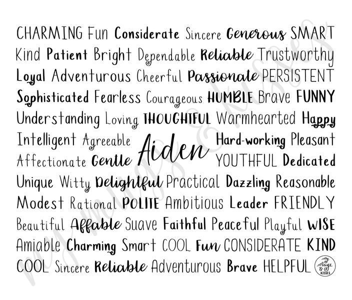 Each travel mug is made to order just for you so make sure to take advantage of our personalization software and add a few words to the list that express what you love about Aiden, or create a unique list that might include the names of family members and friends, important dates and events, professional positions and accomplishments, favorite activities and hobbies, inside jokes and memories...the possibilities are endless! There is no added cost or processing time for personalizing your travel mug. You can easily type in all your own words, choose colors, pick from several different font options and even see your design update in real time when you make changes!
