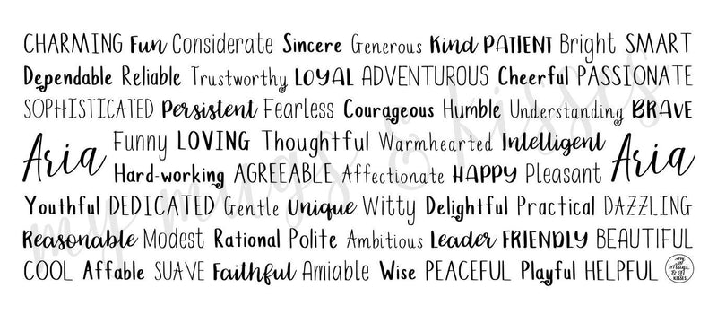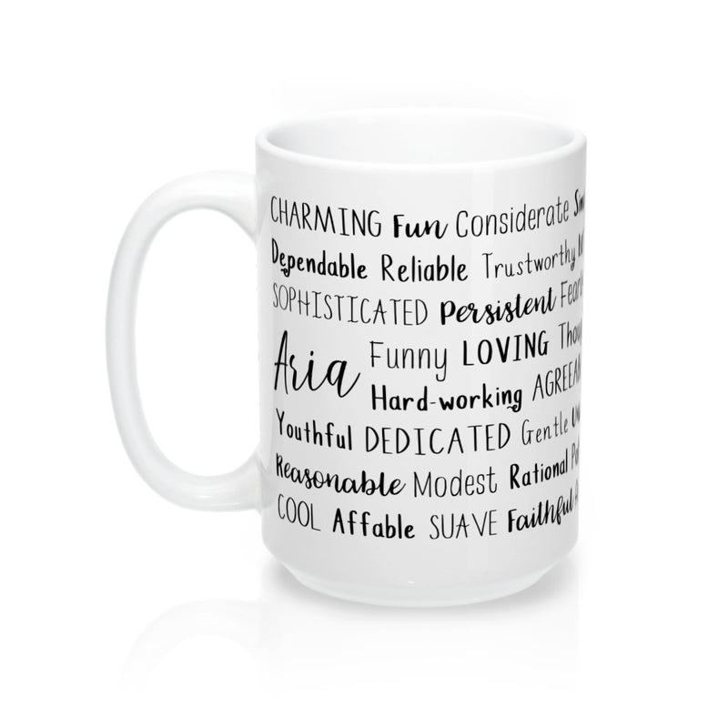 Each mug is made to order just for you so make sure to take advantage of our personalization software and add a few words to the list that express what you love about Aria, or create a unique list that might include the names of family members and friends, important dates and events, professional positions and accomplishments, favorite activities and hobbies, inside jokes and memories...the possibilities are endless! There is no added cost or processing time for personalizing your mug. You can easily type in all your own words, choose colors, pick from several different font options and even see your design update in real time when you make changes!