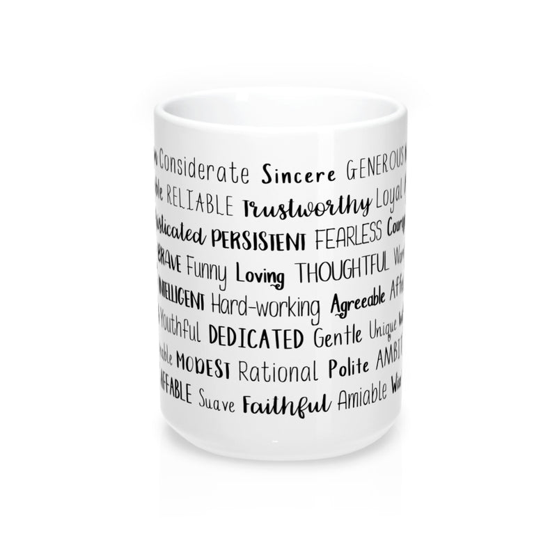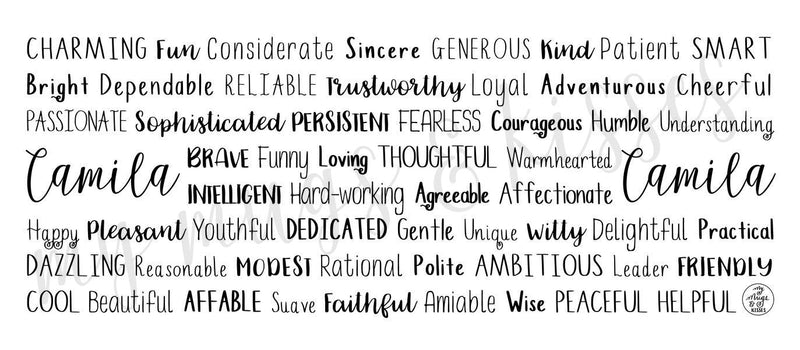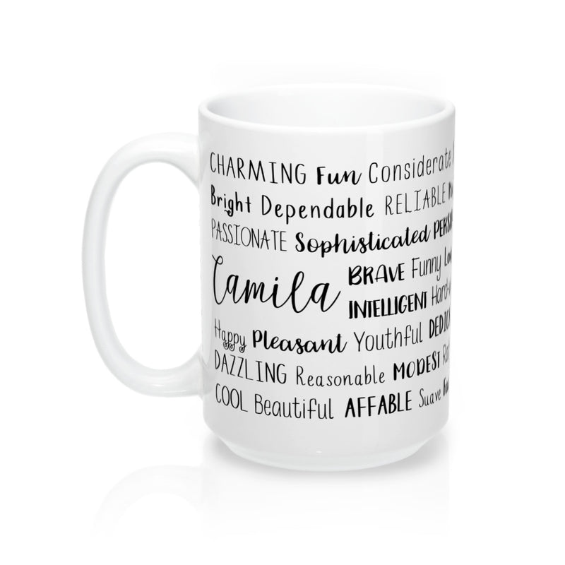 Each mug is made to order just for you so make sure to take advantage of our personalization software and add a few words to the list that express what you love about Camila, or create a unique list that might include the names of family members and friends, important dates and events, professional positions and accomplishments, favorite activities and hobbies, inside jokes and memories...the possibilities are endless! There is no added cost or processing time for personalizing your mug. You can easily type in all your own words, choose colors, pick from several different font options and even see your design update in real time when you make changes!
