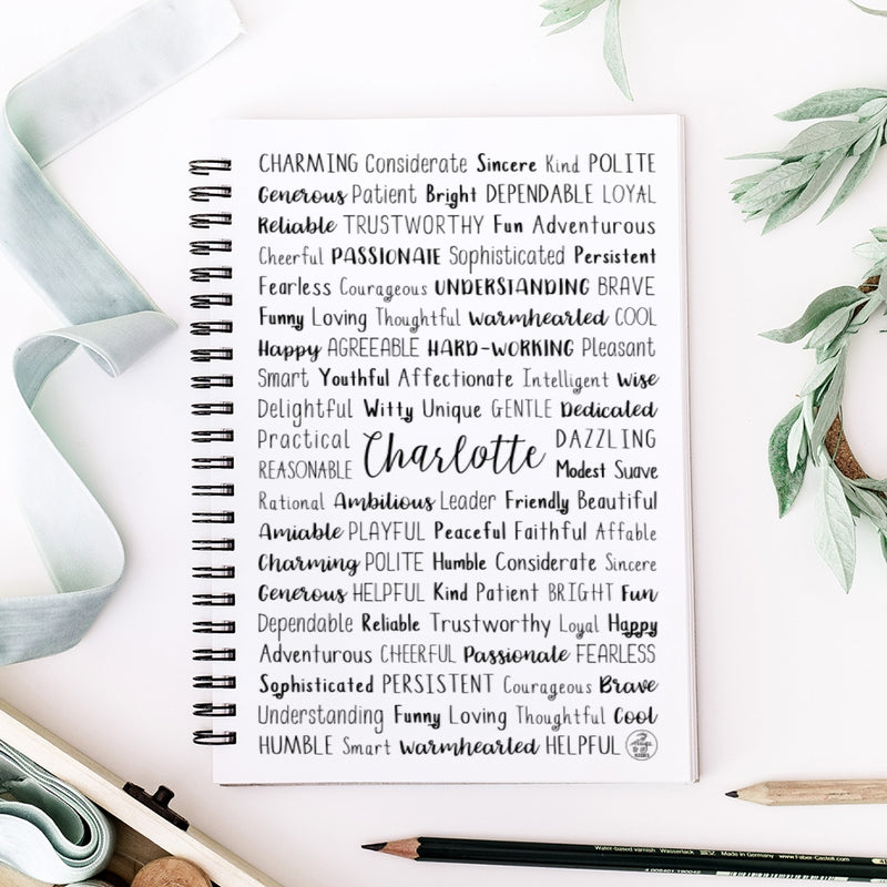 Each spiral notebook is made to order just for you so make sure to take advantage of our personalization software and add a few words to the list that express what you love about Charlotte, or create a unique list that might include names of family members and friends, important dates and events, professional positions and accomplishments, favorite activities and hobbies, inside jokes and memories...the possibilities are endless! There is no added cost or processing time for personalizing your notebook. You can easily type in all your own words, choose colors, pick from several different font options and even see your design update in real time when you make changes!