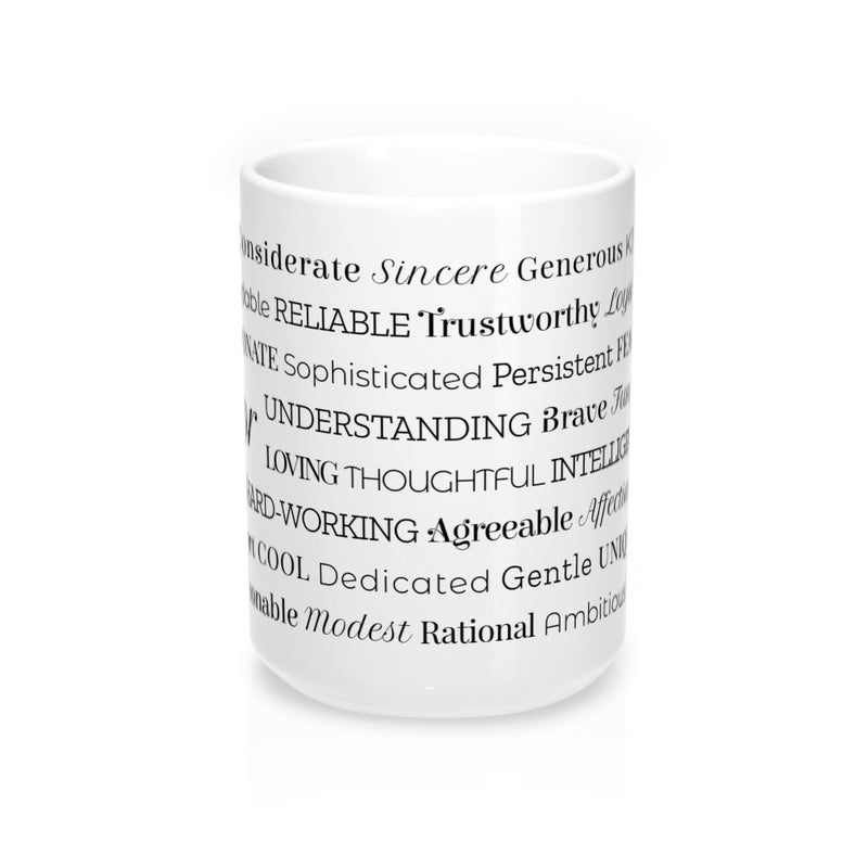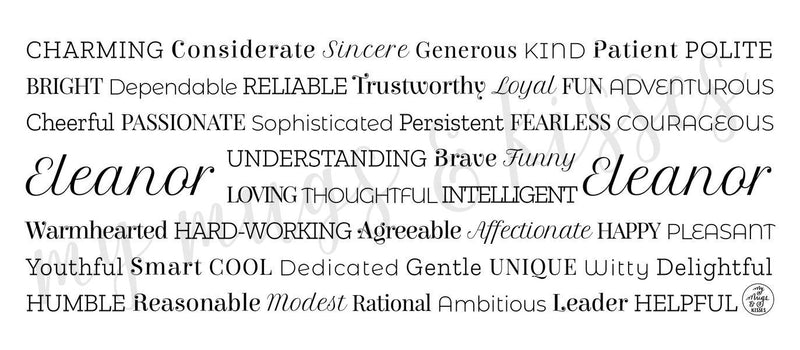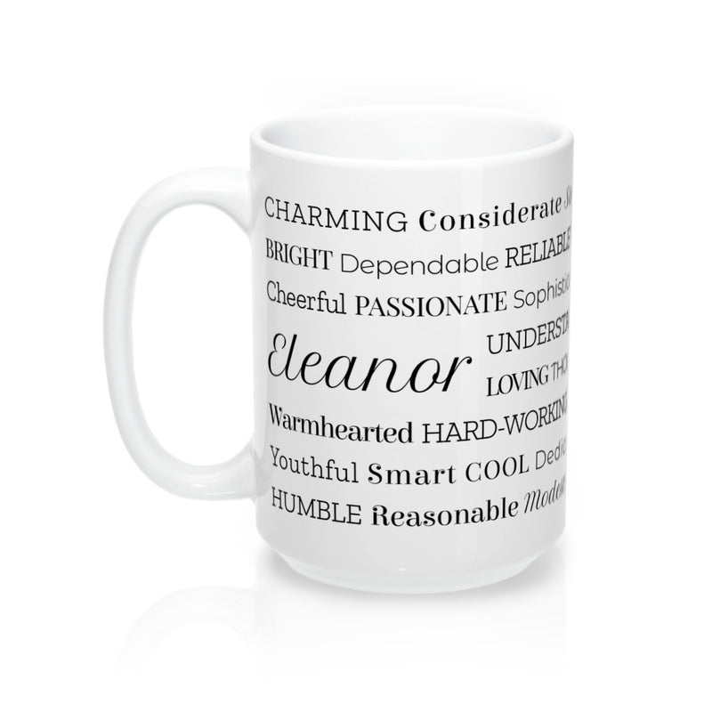 Each mug is made to order just for you so make sure to take advantage of our personalization software and add a few words to the list that express what you love about Eleanor, or create a unique list that might include the names of family members and friends, important dates and events, professional positions and accomplishments, favorite activities and hobbies, inside jokes and memories...the possibilities are endless! There is no added cost or processing time for personalizing your mug. You can easily type in all your own words, choose colors, pick from several different font options and even see your design update in real time when you make changes!