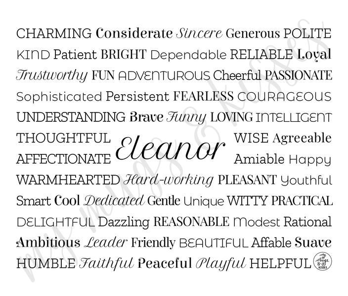 Each travel mug is made to order just for you so make sure to take advantage of our personalization software and add a few words to the list that express what you love about Eleanor, or create a unique list that might include the names of family members and friends, important dates and events, professional positions and accomplishments, favorite activities and hobbies, inside jokes and memories...the possibilities are endless! There is no added cost or processing time for personalizing your travel mug. You can easily type in all your own words, choose colors, pick from several different font options and even see your design update in real time when you make changes!