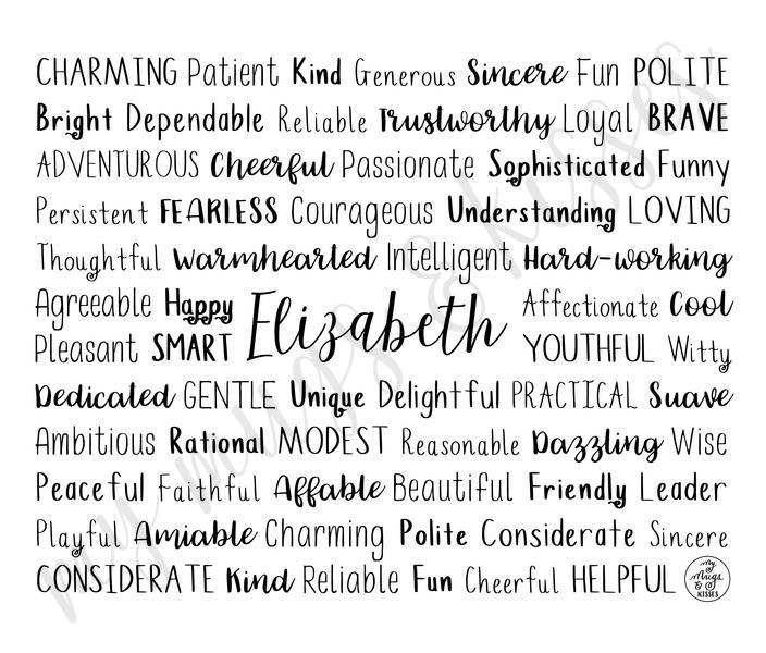 Each travel mug is made to order just for you so make sure to take advantage of our personalization software and add a few words to the list that express what you love about Elizabeth, or create a unique list that might include the names of family members and friends, important dates and events, professional positions and accomplishments, favorite activities and hobbies, inside jokes and memories...the possibilities are endless! There is no added cost or processing time for personalizing your travel mug. You can easily type in all your own words, choose colors, pick from several different font options and even see your design update in real time when you make changes!