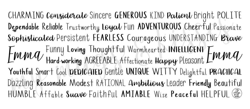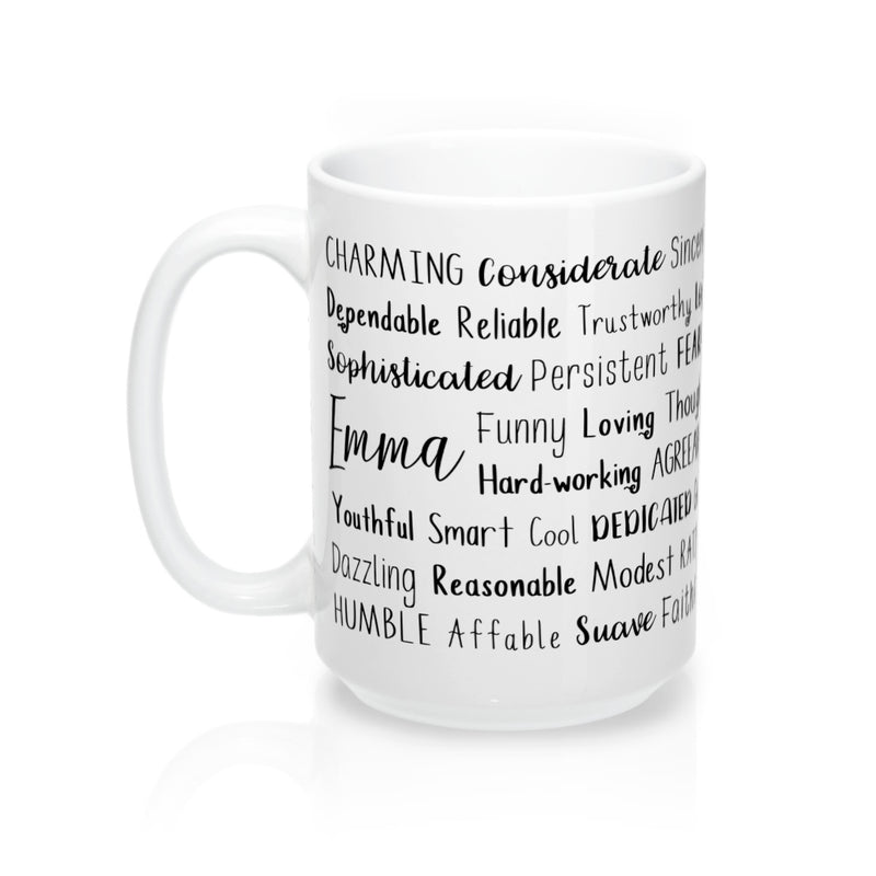 Each mug is made to order just for you so make sure to take advantage of our personalization software and add a few words to the list that express what you love about Emma, or create a unique list that might include the names of family members and friends, important dates and events, professional positions and accomplishments, favorite activities and hobbies, inside jokes and memories...the possibilities are endless! There is no added cost or processing time for personalizing your mug. You can easily type in all your own words, choose colors, pick from several different font options and even see your design update in real time when you make changes!