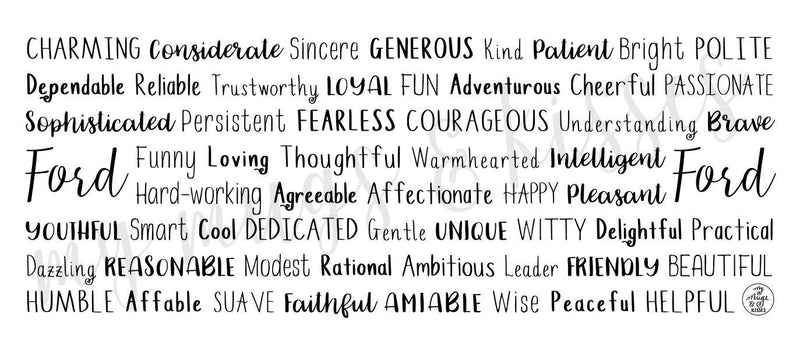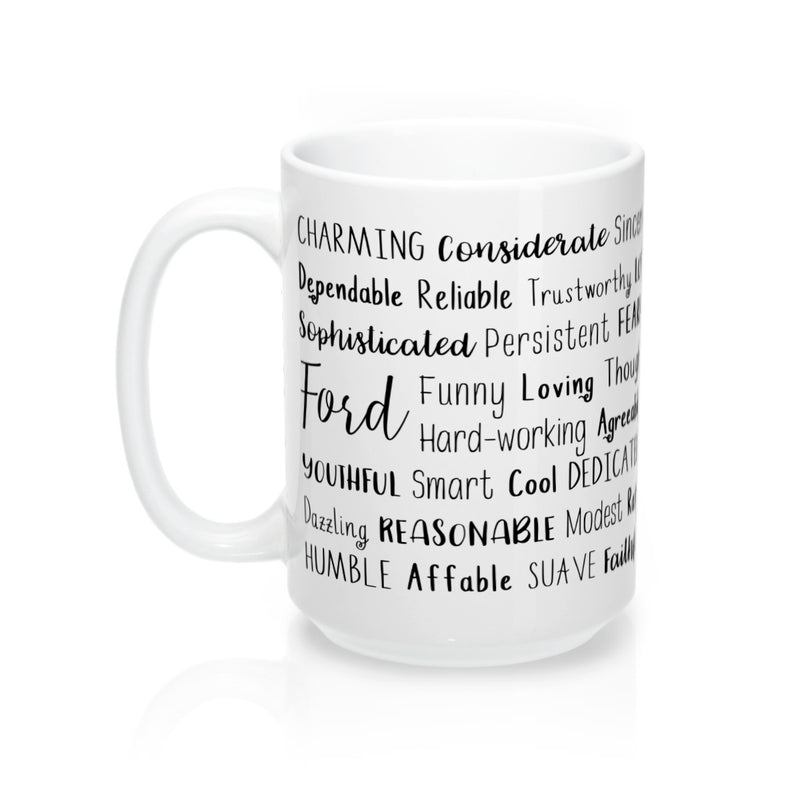 Each mug is made to order just for you so make sure to take advantage of our personalization software and add a few words to the list that express what you love about Ford, or create a unique list that might include the names of family members and friends, important dates and events, professional positions and accomplishments, favorite activities and hobbies, inside jokes and memories...the possibilities are endless! There is no added cost or processing time for personalizing your mug. You can easily type in all your own words, choose colors, pick from several different font options and even see your design update in real time when you make changes!