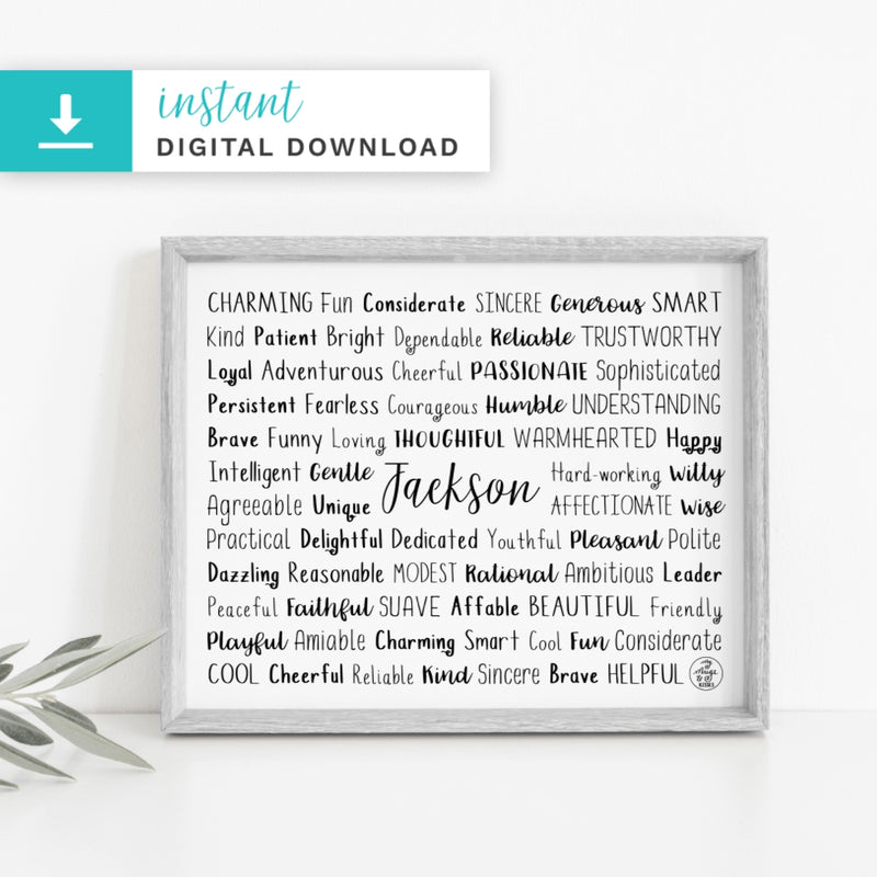 Each Jackson Digital Download is customizable so make sure to take advantage of our personalization software and add a few words to the list that express what you love about Jackson, or create a unique list that might include names of family members and friends, important dates and events, professional positions and accomplishments, favorite activities and hobbies, inside jokes and memories...the possibilities are endless! There is no added cost for personalizing your digital download. You can easily type in all your own words, choose colors, pick from several different font options and even see your design update in real time when you make changes!