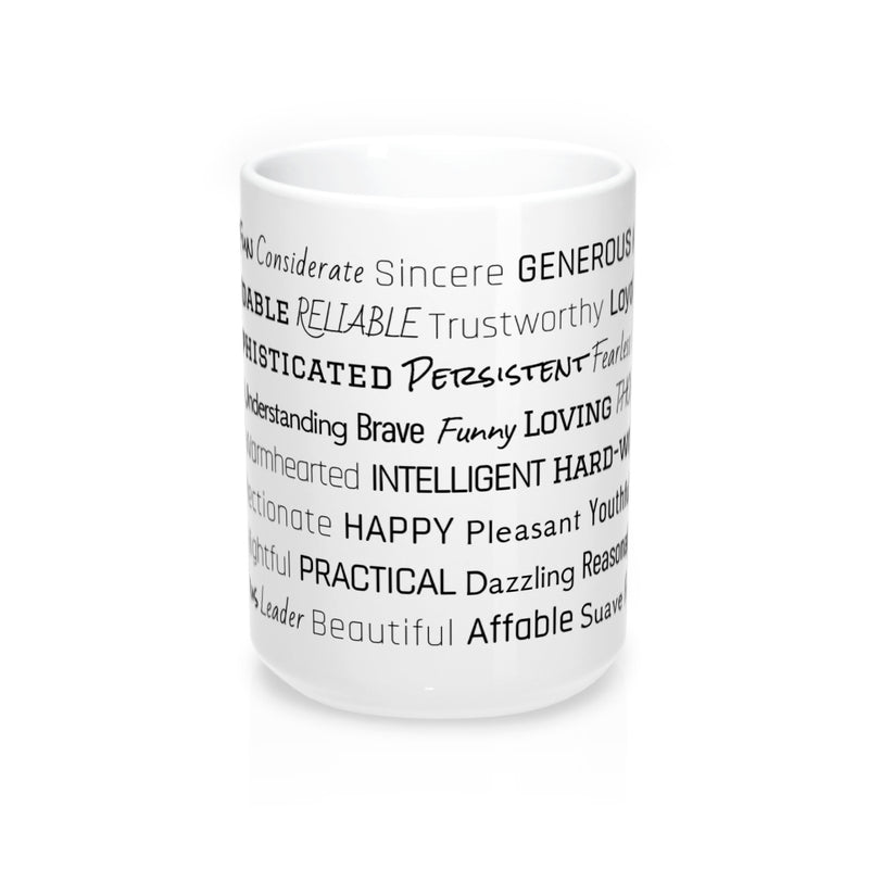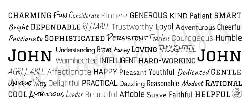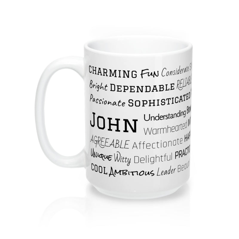 Each mug is made to order just for you so make sure to take advantage of our personalization software and add a few words to the list that express what you love about John, or create a unique list that might include the names of family members and friends, important dates and events, professional positions and accomplishments, favorite activities and hobbies, inside jokes and memories...the possibilities are endless! There is no added cost or processing time for personalizing your mug. You can easily type in all your own words, choose colors, pick from several different font options and even see your design update in real time when you make changes!