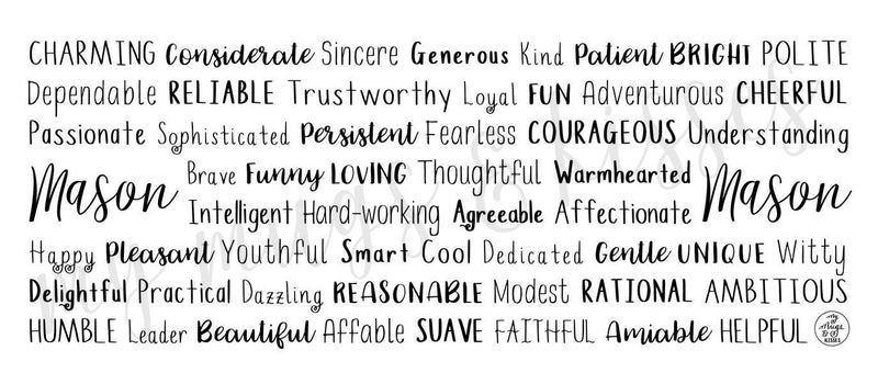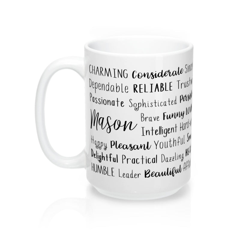 Each mug is made to order just for you so make sure to take advantage of our personalization software and add a few words to the list that express what you love about Mason, or create a unique list that might include the names of family members and friends, important dates and events, professional positions and accomplishments, favorite activities and hobbies, inside jokes and memories...the possibilities are endless! There is no added cost or processing time for personalizing your mug. You can easily type in all your own words, choose colors, pick from several different font options and even see your design update in real time when you make changes!