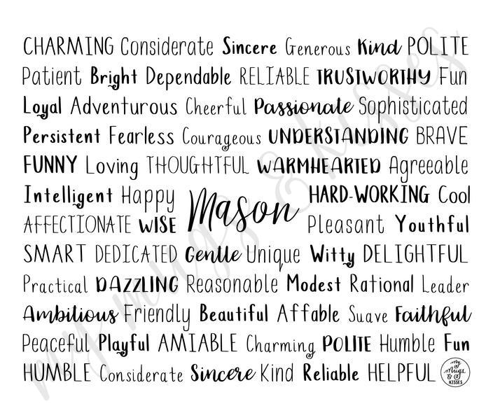 Each travel mug is made to order just for you so make sure to take advantage of our personalization software and add a few words to the list that express what you love about Mason, or create a unique list that might include the names of family members and friends, important dates and events, professional positions and accomplishments, favorite activities and hobbies, inside jokes and memories...the possibilities are endless! There is no added cost or processing time for personalizing your travel mug. You can easily type in all your own words, choose colors, pick from several different font options and even see your design update in real time when you make changes!