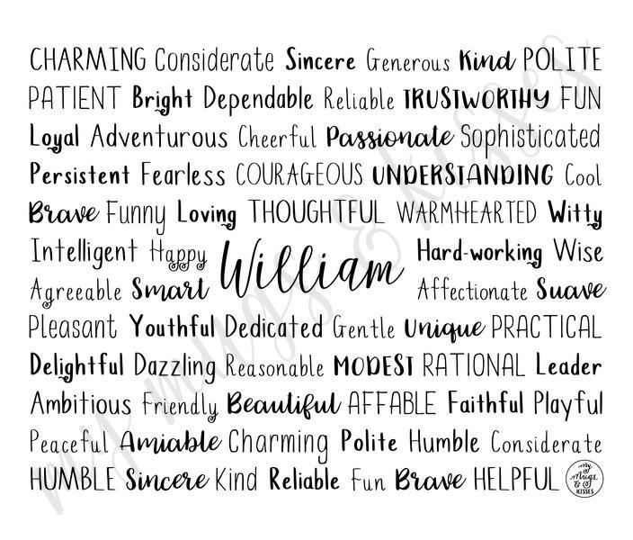 Each travel mug is made to order just for you so make sure to take advantage of our personalization software and add a few words to the list that express what you love about William, or create a unique list that might include the names of family members and friends, important dates and events, professional positions and accomplishments, favorite activities and hobbies, inside jokes and memories...the possibilities are endless! There is no added cost or processing time for personalizing your travel mug. You can easily type in all your own words, choose colors, pick from several different font options and even see your design update in real time when you make changes!