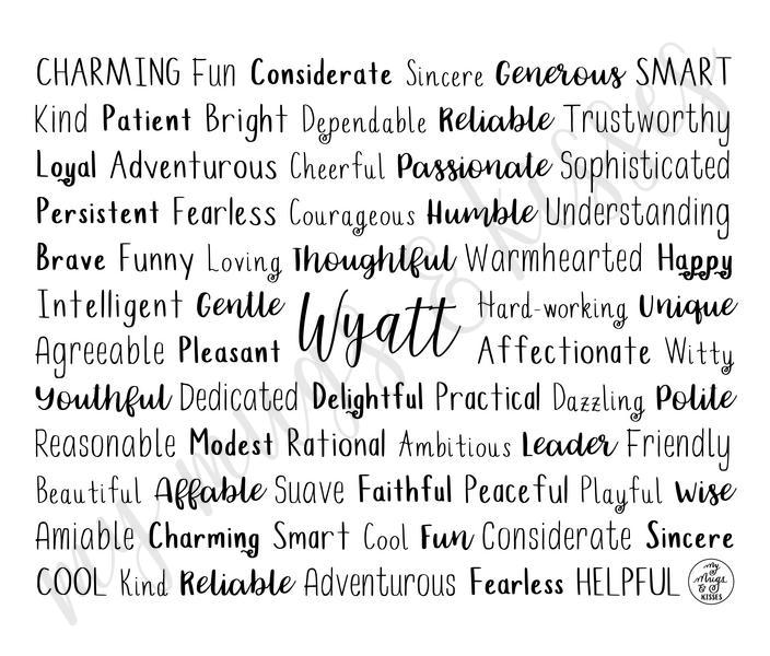 Each travel mug is made to order just for you so make sure to take advantage of our personalization software and add a few words to the list that express what you love about Wyatt, or create a unique list that might include the names of family members and friends, important dates and events, professional positions and accomplishments, favorite activities and hobbies, inside jokes and memories...the possibilities are endless! There is no added cost or processing time for personalizing your travel mug. You can easily type in all your own words, choose colors, pick from several different font options and even see your design update in real time when you make changes!
