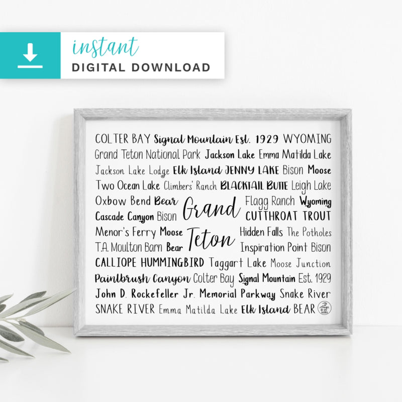 Our Grand Teton Digital Download features the landmarks and attractions around Grand Teton. This elegant design will add a touch of beauty to any setting.