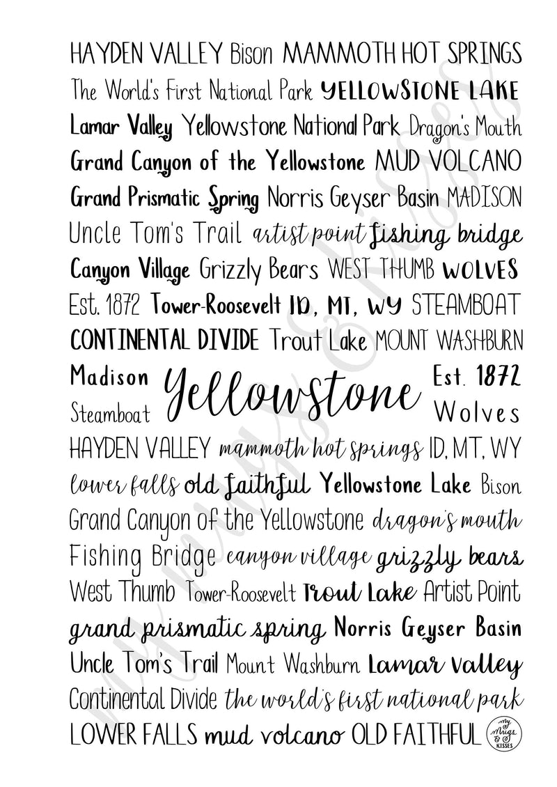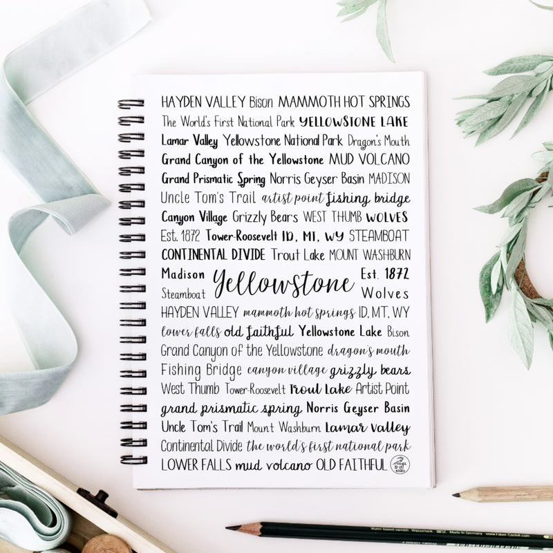 Our lettered spiral notebook design features the best of Yellowstone National Park. Feel free to personalize the list of words so your favorite memories appear on the cover!