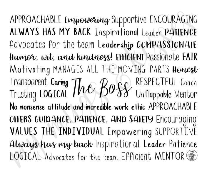 Give your favorite The Boss the perfect gift. As they enjoy their favorite drink they will appreciate reading the kind thoughts that wrap around this special Boss Travel Mug.