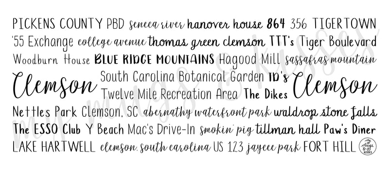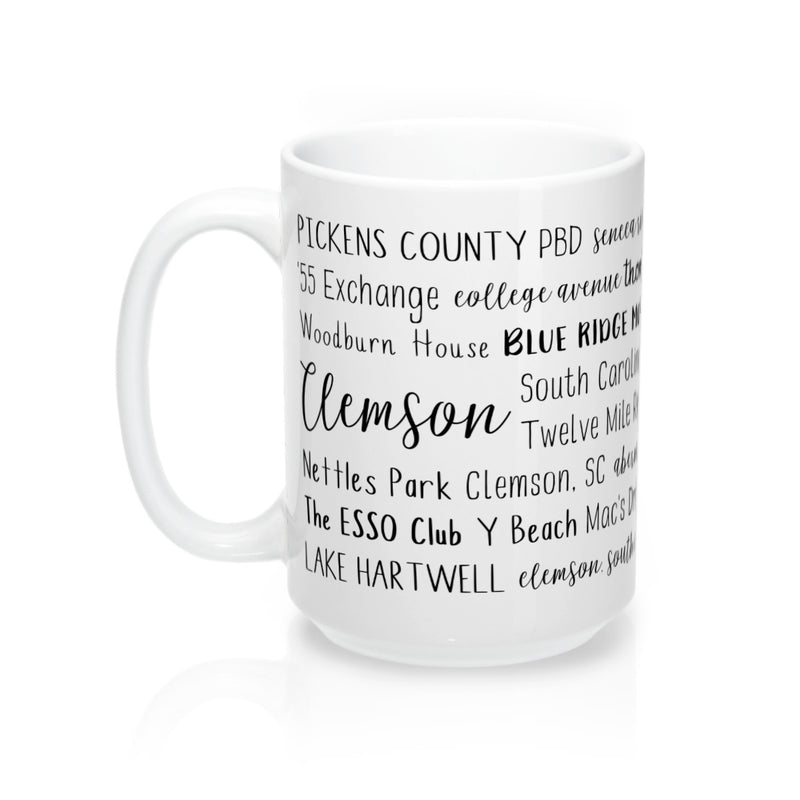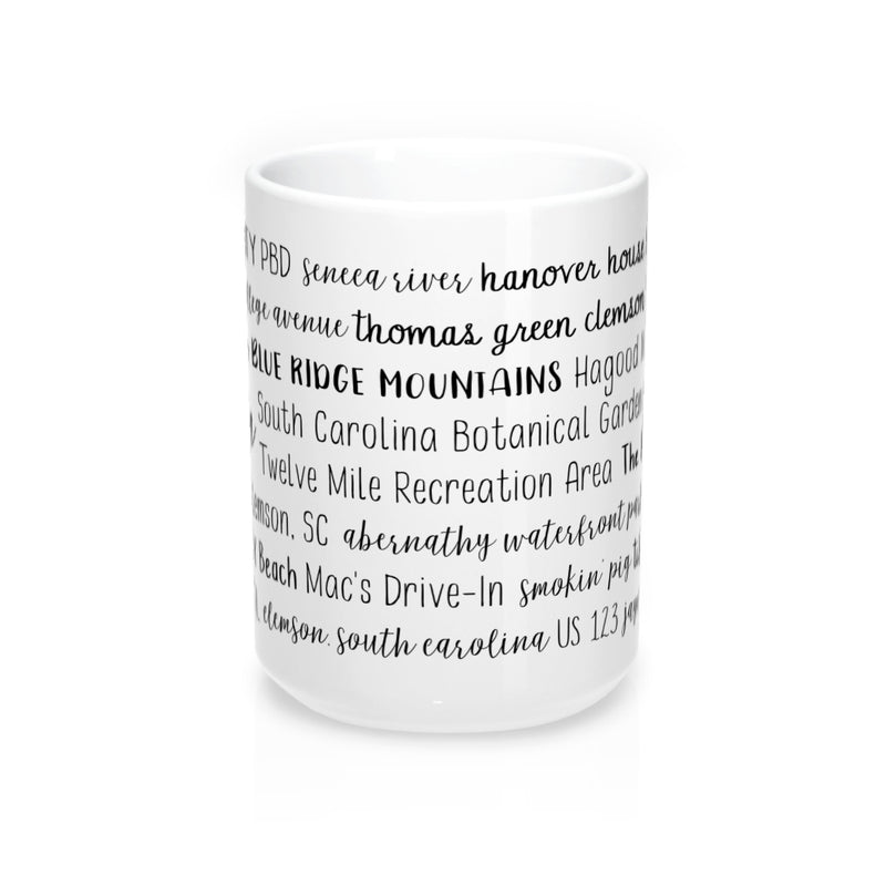 Our Clemson, South Carolina wrap-around design features iconic landmarks, traditions, and places around the city. Feel free to personalize the list of words so your favorite memories appear on the mug!
