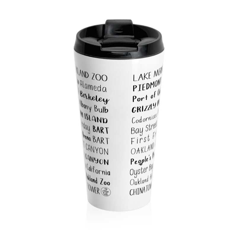 Go down memory lane as you enjoy your favorite drink while reading the landmarks and attractions that wrap around our Oakland, CA Travel Mug.
