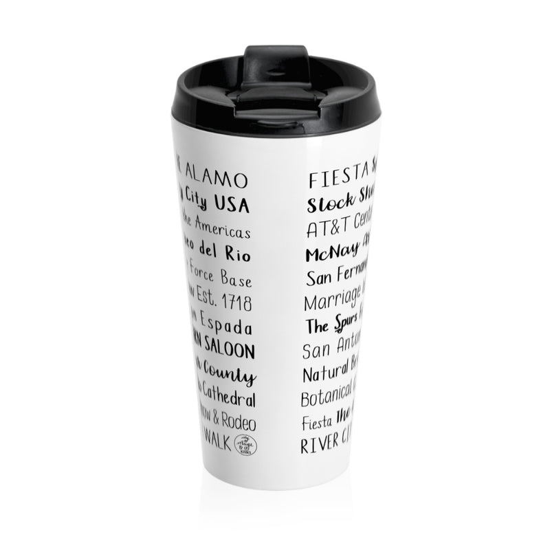 Go down memory lane as you enjoy your favorite drink while reading the landmarks and attractions that wrap around our San Antonio, TX Travel Mug.
