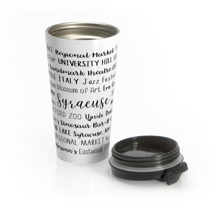 Go down memory lane as you enjoy your favorite drink while reading the landmarks and attractions that wrap around our Syracuse, NY Travel Mug.